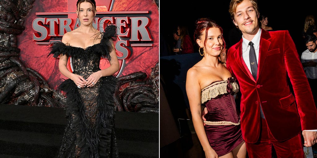 3+ week, 1+ day ago (527+ words) Millie Bobby Brown donned two sexy looks at the "Stranger Things" season five premiere. Brown, 21, wore a sheer, strapless brown dress as her first look. The dress had lace detailing and black feathers. The actress wore her hair up in a bun and accessorized with dangly earrings. She posed on the red carpet with her husband, Jake Bongiovi. Millie Bobby Brown wore two looks at the "Stranger Things" premiere with husband, Jake Bongiovi. (Getty Images) After the premiere in Hollywood, Brown slipped into a red mini corset dress. This look featured cream lace detailing on the top and bottom of the corset. Bongiovi wore a red, velvet suit with a skinny black tie to the premiere and the after party. SYDNEY SWEENEY SLIPS INTO SWIMSUITS FOR BIRTHDAY 'TRIP TO MARS' After announcing their engagement in April 2023, Brown and Bongiovi tied…...